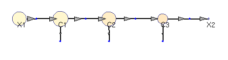 The model describes a chain of enzymatic reactions with mass-action kinetics. The forward and reverse rate constants are set to values of 1 and 0.1, respectively. The benefit function scores the average flux (i.e., the rate of product production). Pathway intermediates are destroyed by non-enzymatic reactions, which therefore compete with the pathway flux. Autonomous waves of enzyme activity (without an external substrate rhythm) can increase the average flux and are thus beneficial. (Legend: squares represent enzymes, circles represent metabolites)