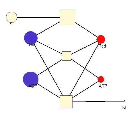 This model illustrates the idea that metabolism could oscillate, on the one hand, between between oxidative and reductive phases and, on the other, between high-energy and low-energy phases (with high or low ATP levels, respectively). In a first reaction (central metabolism(, substrate is converted into rediction equivalents (e.g., NADH produced in the TCA cyle). A second reaction (oxidative phosphorylation) converts reduction equivalents into ATP. A third reaction (anabolism) consumes NADH and ATP to produce biomass.